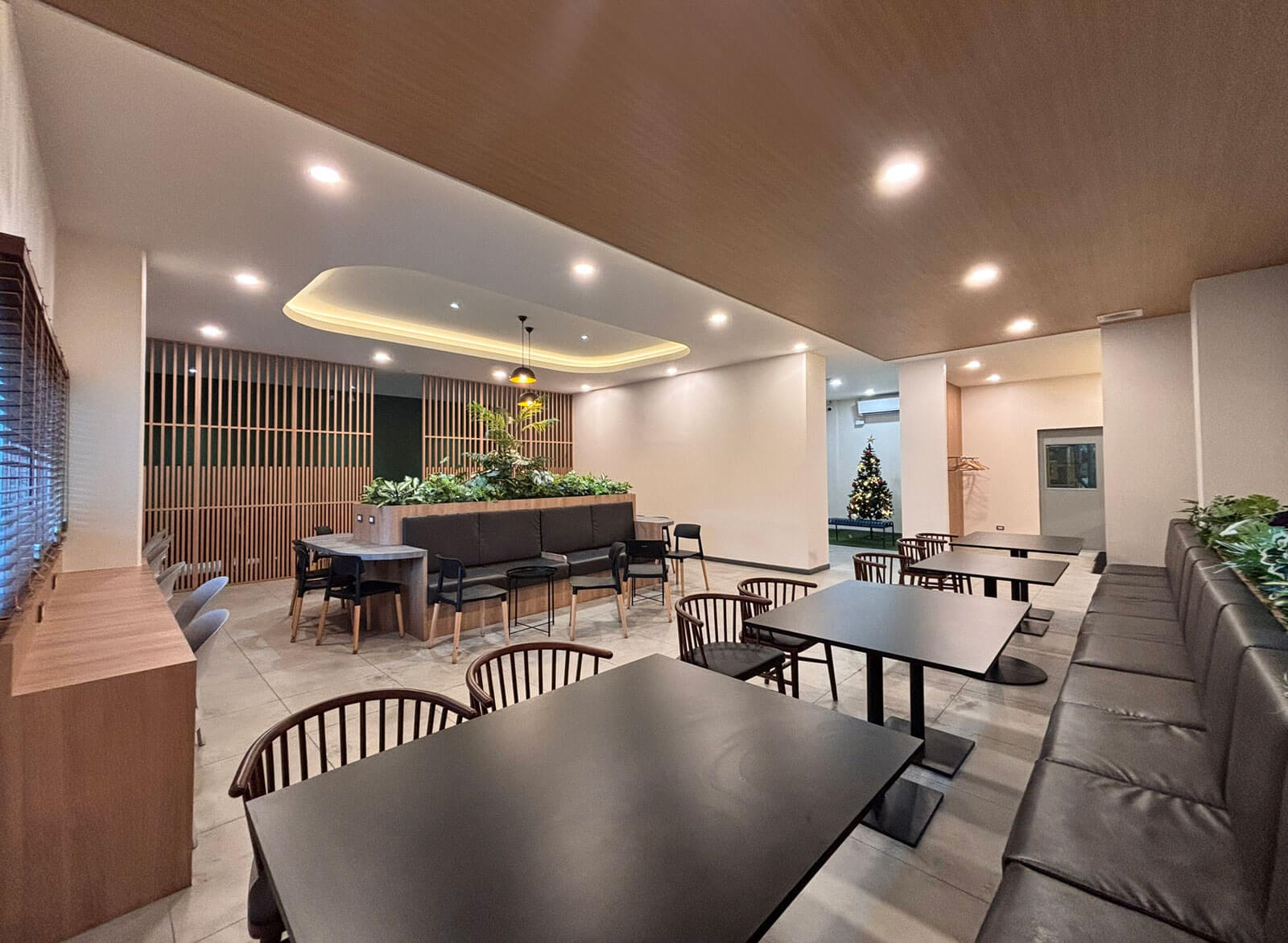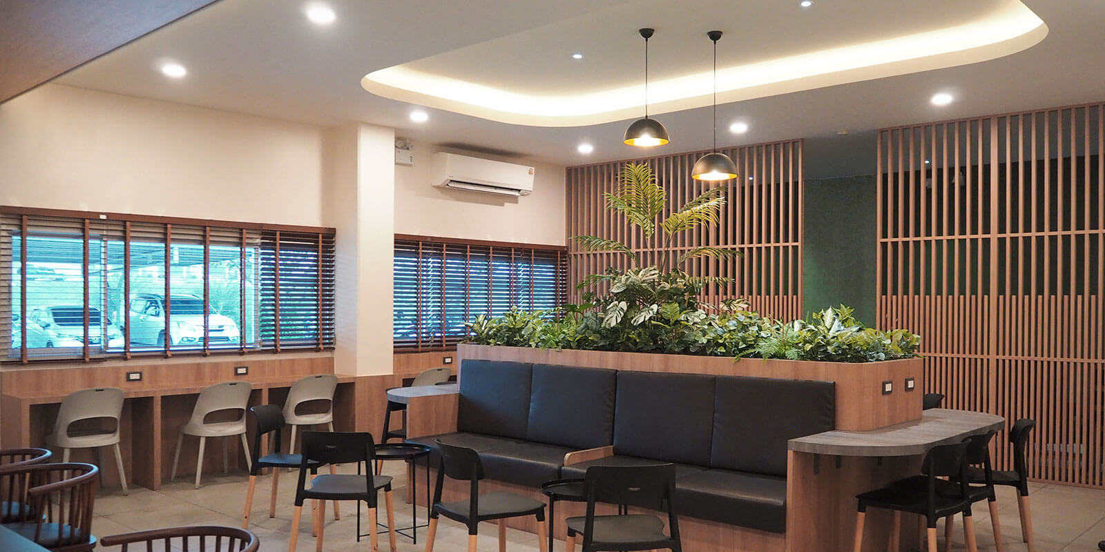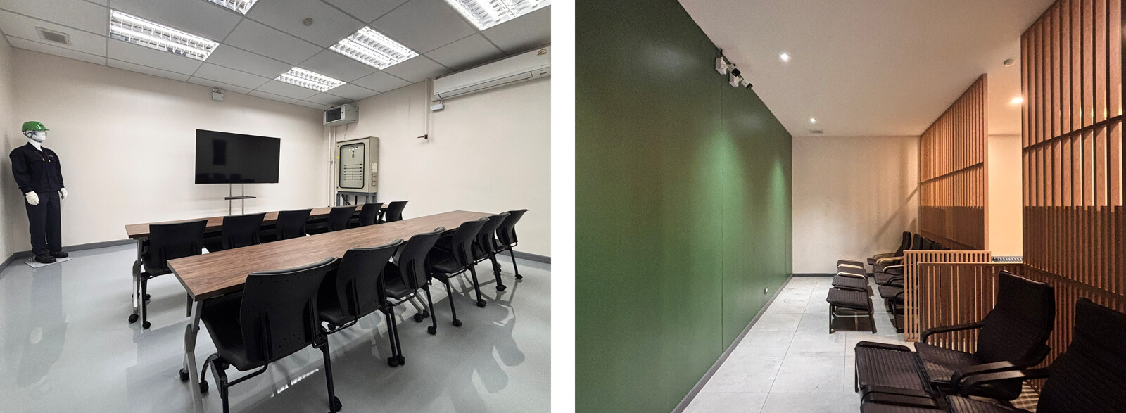 自動車部品の製造企業であるサムテック(タイ)の既存工場における部分改修プロジェクト。組織内の施設および運営改善の一環として、工場の一部を刷新し、従業員の心身のリフレッシュを促すリラクゼーションエリアおよび道場室を新たに整備した。準備ゾーンには、安全ヘルメットラック、作業着ハンガー、手洗いスペースを設け、利用前に身支度や清掃ができるよう配慮している。主となるリラクゼーションエリアには、最大54名が利用可能なゆとりある座席を確保した。仮眠エリアは木製ルーバーの間仕切りによって主休憩エリアと分けられており、プライバシーを確保しつつも、安全および防犯の観点から視認性を維持し、質の高い休息環境を実現している。室内の仕上げ材および家具の色は、従業員が安全靴を着用することを想定し、工場の汚れに対する耐久性と清掃のしやすさを考慮して選定。床はグレーのセラミックタイル、家具はダークトーンのラミネート仕上げ、壁は拭き取り可能な塗装仕上げとすることで、美観の維持と運用負荷の低減を両立させた。このような現場視点の細やかな配慮により、働く環境の質を高め、企業の持続的な成長を支える基盤を整えた。